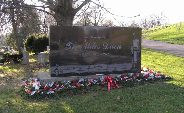 Miles Davis’ graf in Woodlawn Cemetery. De steen bevat een inscriptie van de eerste noten van zijn compositie Solar