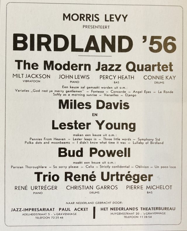 Aankonding voor het concert op 3 november 1956 (noot: Bud Powell was uiteindelijk niet van de partij)