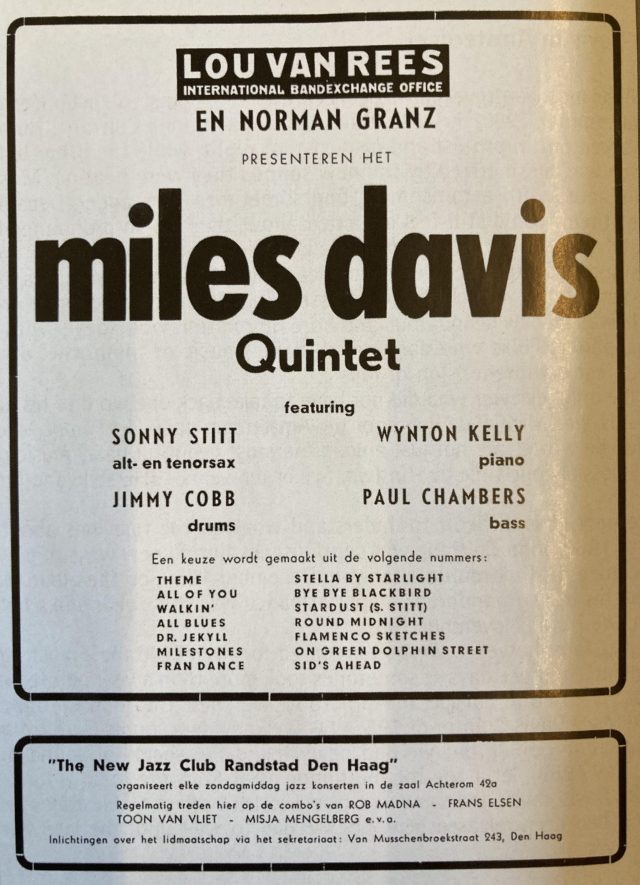 Op 9 april 1960 organiseerde de Amerikaanse jazzproducer en -promotor Norman Granz samen met de Nederlandse impresario Lou van Rees een avond ‘Jazz at the Philharmonic’ in het Kurhaus in Scheveningen, met in de line-up het Oscar Peterson Trio, het Stan Getz Quartet – bassist Ray Brown speelde in allebei – en het Miles Davis Quintet. Die laatste set was vanaf 21.30 uur rechtstreeks op de radio, vanwege de VARA-jazzweek. Een groot deel van het publiek van de nachtelijke herhaling van deze driedelige Amerikaanse jazzparade in Het Concertgebouw zal eerst nog aan de radio gekluisterd hebben gezeten voor het optreden van het Miles Davis Quintet.